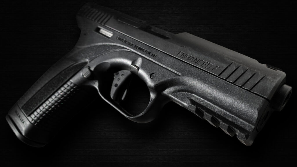 Up front, the Enhanced F features a standard 1913 accessory rail for mounting lights and lasers, followed by a large, rounded trigger guard that allows the gun to be operated while wearing gloves.