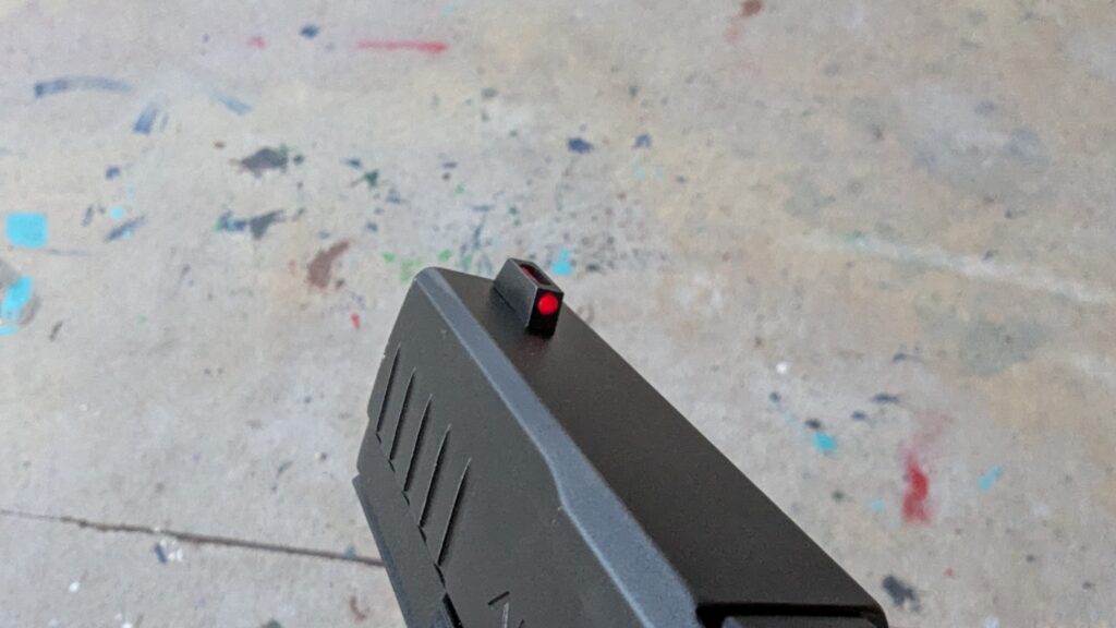The sights are metal, which many of us will appreciate. I’ve had more polymer iron sights break than red dots. The rear sight is two big green orbs, and the front sight is a big red orb. They do catch the eye well, and are very large.