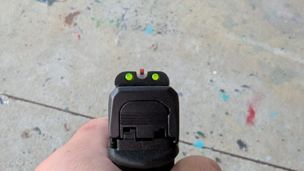 A trip home and the application of a Glock front sight tool fixed that issue. Finally, the APOC was consistently hitting where I wanted. The big sights make it easy to find the sights and start shooting. The contrast between the red and green sights is nice, and their size and bright nature make them easy to track.