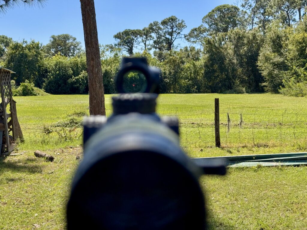In a sea of positives, brightness is its Achilles’ heel. Even at max setting, the dot struggles in daylight. The attached photo was taken in the shade at full brightness, and to my eye, it was barely visible.