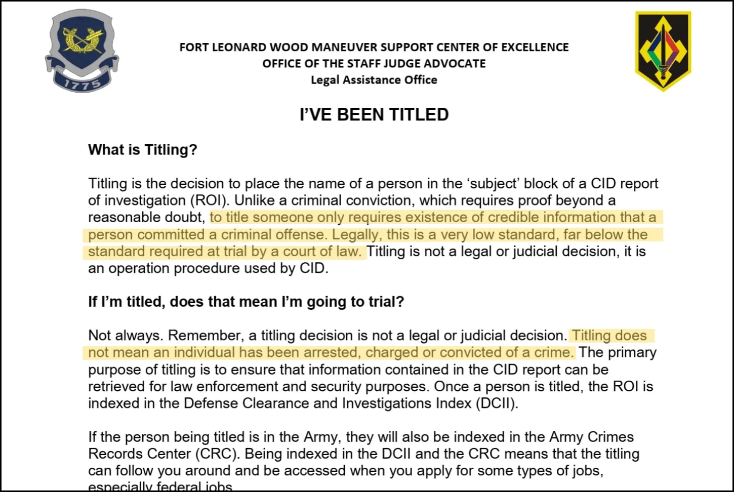 In the military, titling only requires the existence of “credible information” that a crime was committed. “Legally, this is a very low standard, far below the standard required at trial by a court of law,” according to Fort Leonard Wood’s Army legal assistance office.