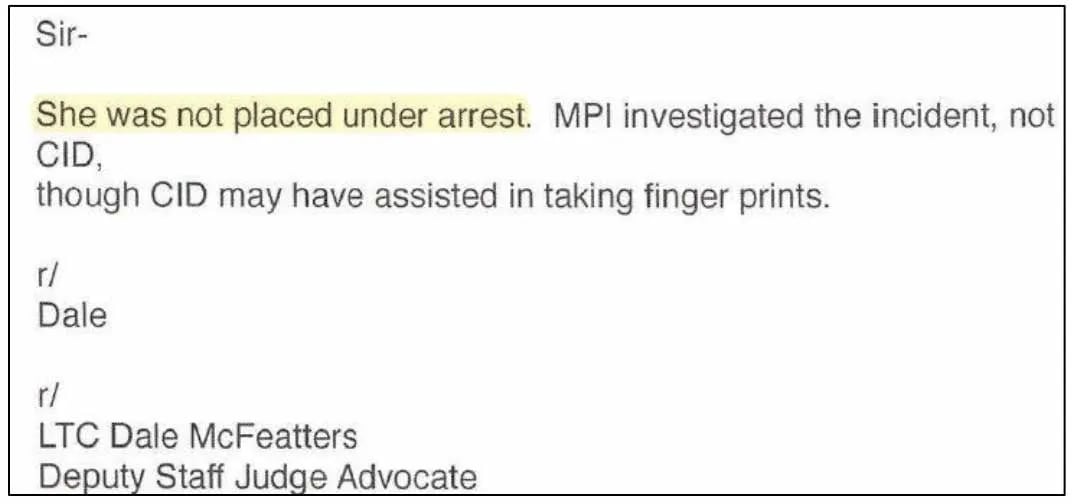 Back in May 2021, an Army JAG officer confirmed in an email to one of Rosales’ lawyers that she had not been arrested for the incident in Kuwait. Despite the acknowledgement, the Army Criminal Investigation Division denied her request and a subsequent appeal to have her records corrected.