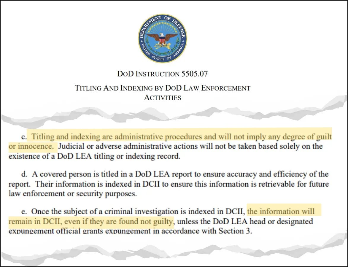 “Once the subject of a criminal investigation is indexed in” the database known as the Defense Central Index of Investigations, the information remains “even if they are found not guilty”—unless DOD law enforcement officials agree to expunge the record.