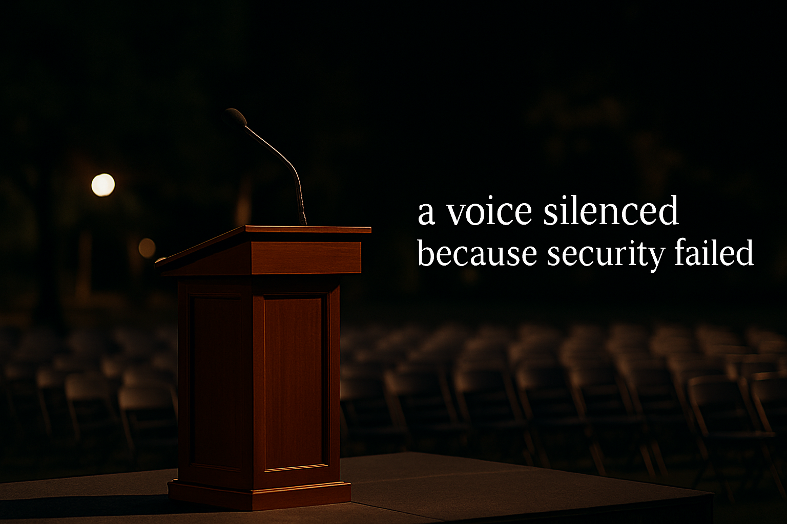 Context: On September 10, 2025, conservative activist Charlie Kirk was fatally shot during an outdoor event at Utah Valley University. Law enforcement described it as a “political assassination,” with shots reportedly fired from ~200 yards. [1] Despite the presence of security, the attacker was able to establish a firing position undetected — a catastrophic perimeter failure.