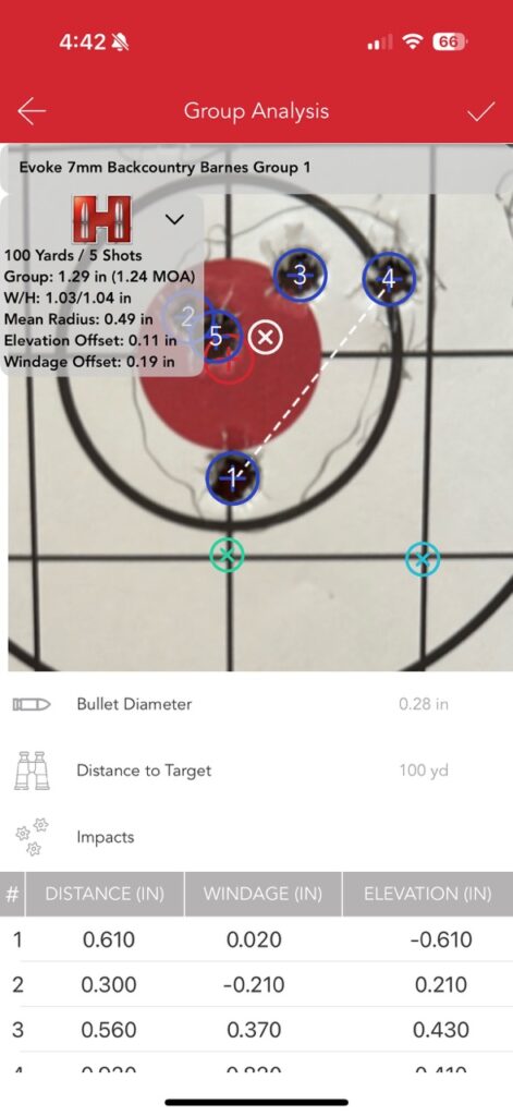 For practical purposes, a rifle with a 0.5-inch mean radius will put roughly 63% of its shots within a 1-inch circle at 100 yards—valuable information for understanding real-world hunting accuracy. An under 0.3-inch mean radius is typically considered excellent for a match-grade precision rifle. I used Hornady’s Groups Analysis program in their app to measure the mean radius on all the groups.