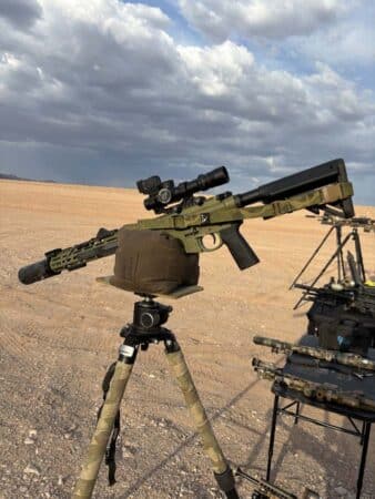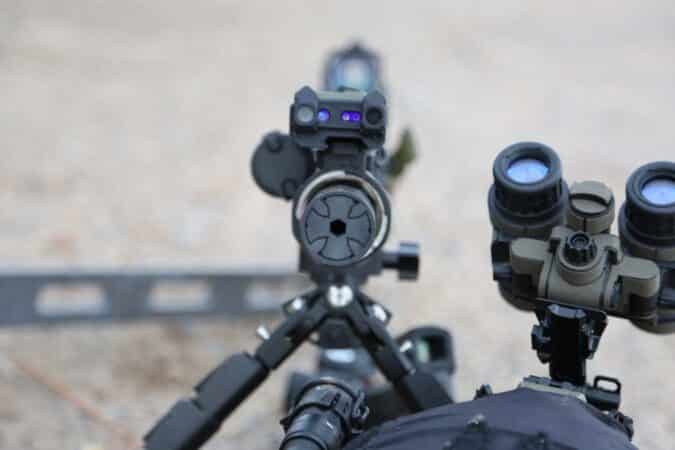 For optics, an EOTECH EXPS3 and 3X magnifier on a UNITY riser and Arisaka Magnifier High Mount with a 3EIR Sentinel-IRV laser was used for night vision and shooting inside 300 yards. For distance, a Nightforce NX8 was used in a Badger Ordnance C1 Mount with a KOENG C1 adapter and an Aimpoint ACRO, all supported by an MDT CYKE-POD Lightweight.