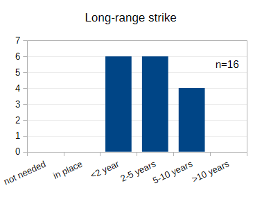 The surveyed analysts were relatively optimistic about Europe’s long-range strike timeline, with six considering it will take less than two years to have adequate capability, while another six assess it will take between two and five years.